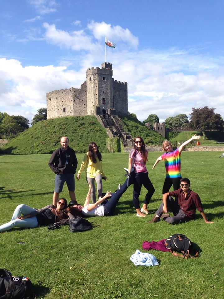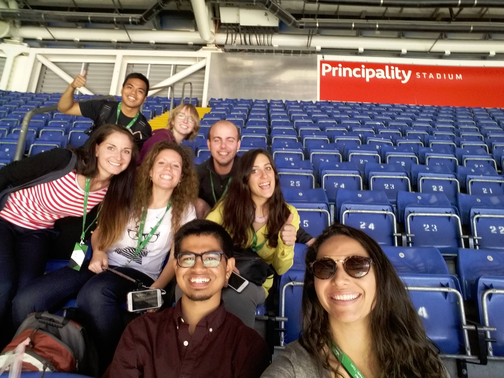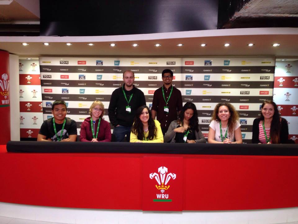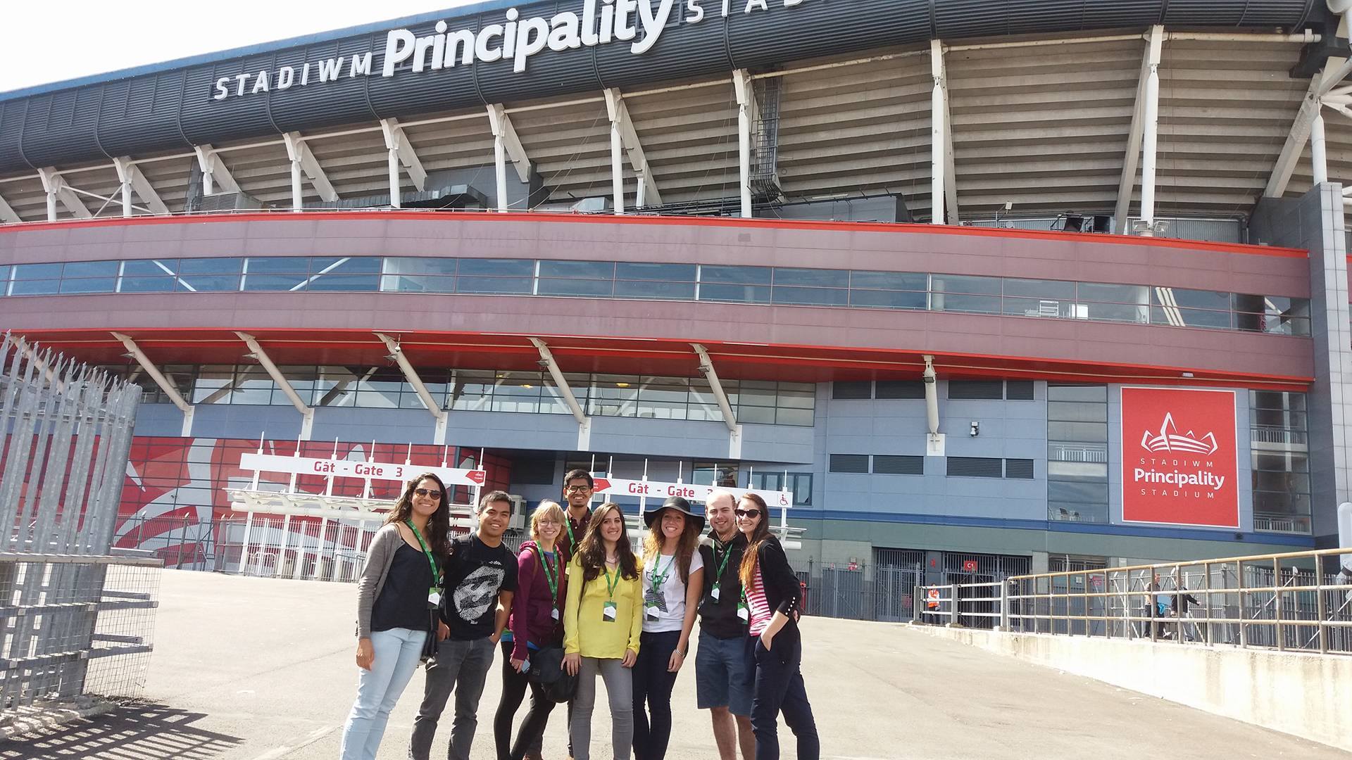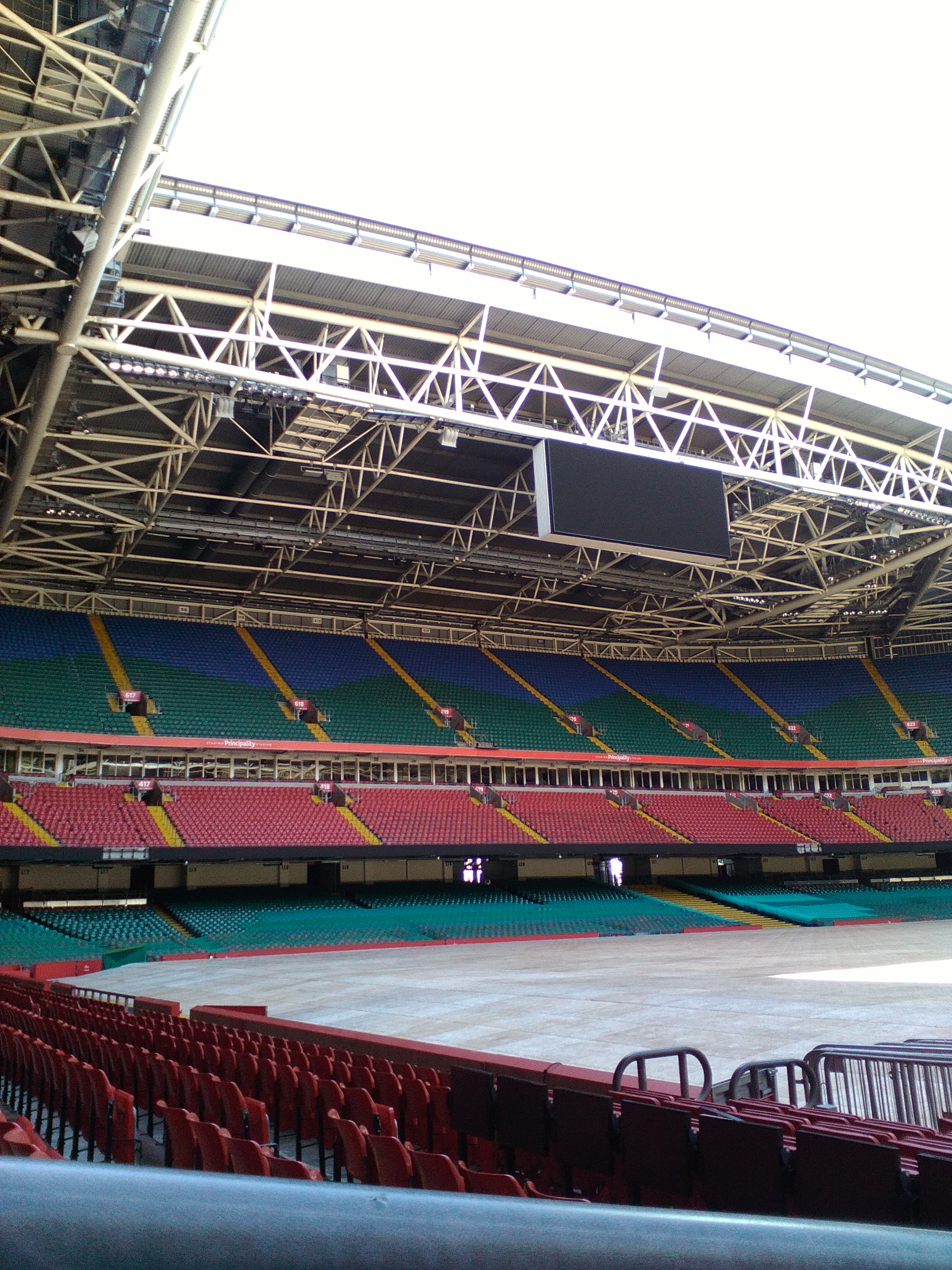 Naším prvním cílem byl Principality Stadium – obrovský stadion postavený v centru města, kde se hraje rugby, závodí monster jams, vystupují slavné kapely, koná se tu tea party atd. My jsme pronikli do útrob této gigantózní stavby. Usedli jsme jako vítězný tým za stůl v místnosti pro tiskové konference, v šatně domácích jsme si vyslechli vzletnou řeč kapitána týmu před nástupem družstva na hřiště. Náš nástup na hřiště doprovodil jásot a skandování nahraného publika. Výtahem jsme vyjeli do nejvyššího patra a po schodech vyběhli až do úplně poslední řady. Poseděli jsme ve V.I.P. salónku a také na místě, kde seděla královna, když tu naposledy byla.