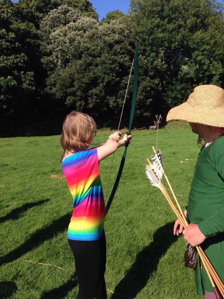 Na nádvoří to žilo. Byly zde stánky se středověkými hudebními, rytířskými, řemeslnými a jinými nástroji. Na louce byl rink, kde se konaly souboje mezi rytíři ve zbroji ale bez ořů. Kratochvíli byla i střelba z luku. Neohroženě jsme si šli také zastřílet. Naděje ve mě vkládané, neb jsem děvče z kraje Robina Hooda, byly marné. Asi jsem v Nottinghamu příliš krátce a ještě jsem nestihla pochytit ty správné grify. Ale uplně marná taky nejsem. Z pěti ran jsem jednou(!) škrtla terč, zůstaly mi obě oči a nikdo nebyl zraněn.