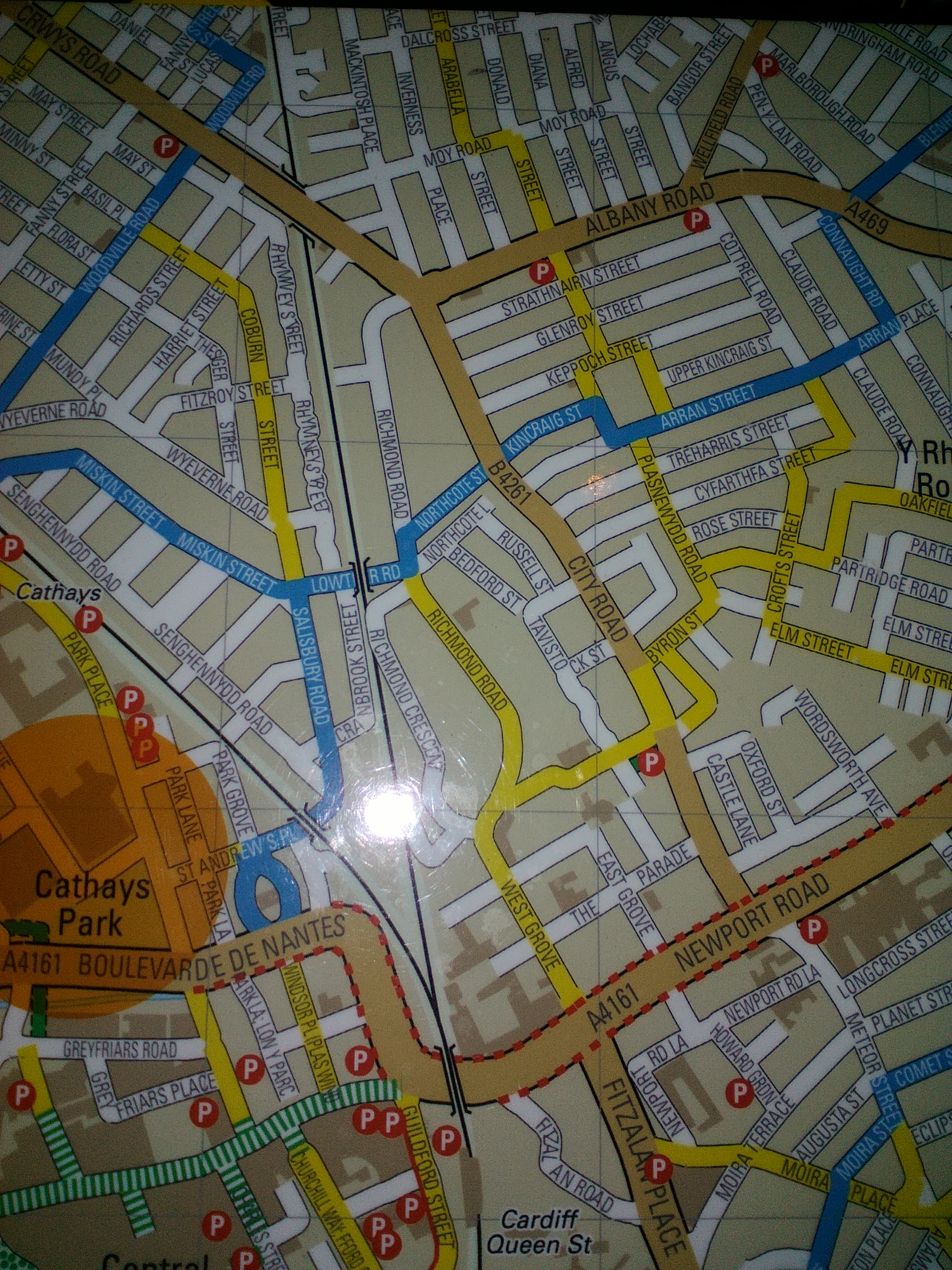 Proč začínám o velštině? Protože jsem se s ní potýkala hned po příjezdu. Na hlavní autobusové nádraží v Cardiffu jsme přijeli krátce před desátou hodinou večerní. Jsa vybavena screenshotem mapy s vyznačenou trasou z nádraží k ubytování, jsem se odvážně vydala na cestu městem. Po 50 m jsem potkala policejní hlídku na kolech. Využila jsem situace a pánů policajtů jsem se tázala, zda jdu správně, jenže jsem nebyla schopná vyslovit jméno ulice (Cyfarthfa Street). Ukázala jsem její název napsaný v mobilu a páni policajti se začali smát. Taky pořádně nevěděli, jak to přečíst. Nicméně nás záhy smích přešel, protože jsem to neměla jen míli, jak pravil strýček GoogleMapy, ale asi dvě a půl. Páni policajti pravili, že si mám vzít taxi, že se nemusím bát, že mě to nezruinuje. Jenže zatímco já jsem se odvážně vydala pěšky na cestu, ostatní cestující zbaběle naskákali do šalamounsky nachystaných taxíků, výsledkem čehož tam žádné taxíky jako na potvoru nebyly. Co naplat. Vyrazila jsem tedy pěšky nasměrována pány policajty. Ujistili mě, že se nemusím bát. Cardiff je bezpečné město a teď v pátek večer je plné lidí. Cestou jsem potkala turistickou tabuli s mapou, vyfotila jsem si ji, pokračovala podle ní a trefila na místo určení. IMG_20160812_221813