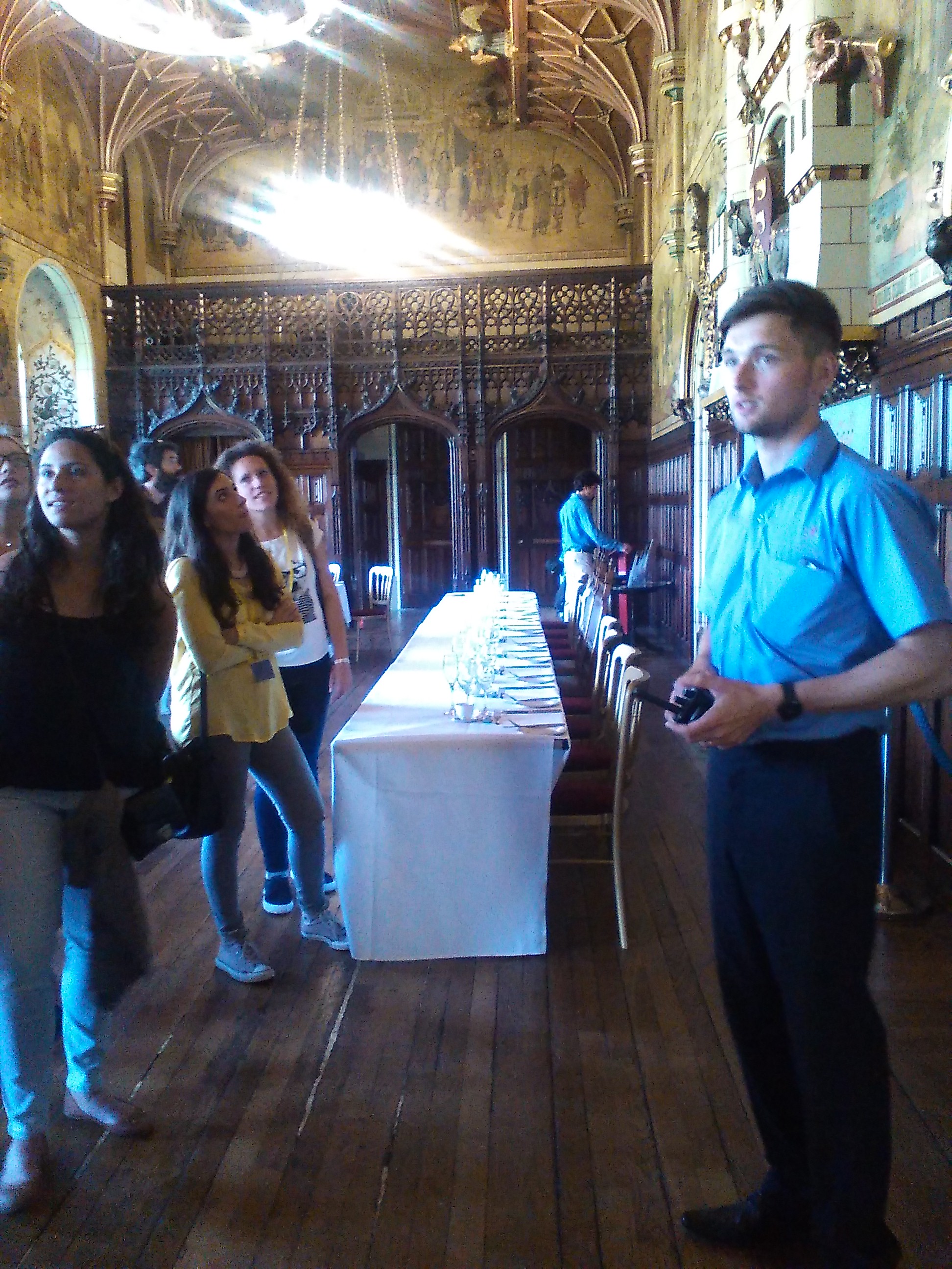 Z nádvoří jsme se přesunuli na prohlídku zámeckých apartmánů. V hlavním sále bylo již prostřeno na velkolepou hostinu. Pan průvodce nás nabádal, ať hlavně na nic nesaháme. Krátce po naší návštěvě se sem totiž nahrnou svatebčané. Btw pronájem téhle místnosti stojí ₤600…za hodinu!