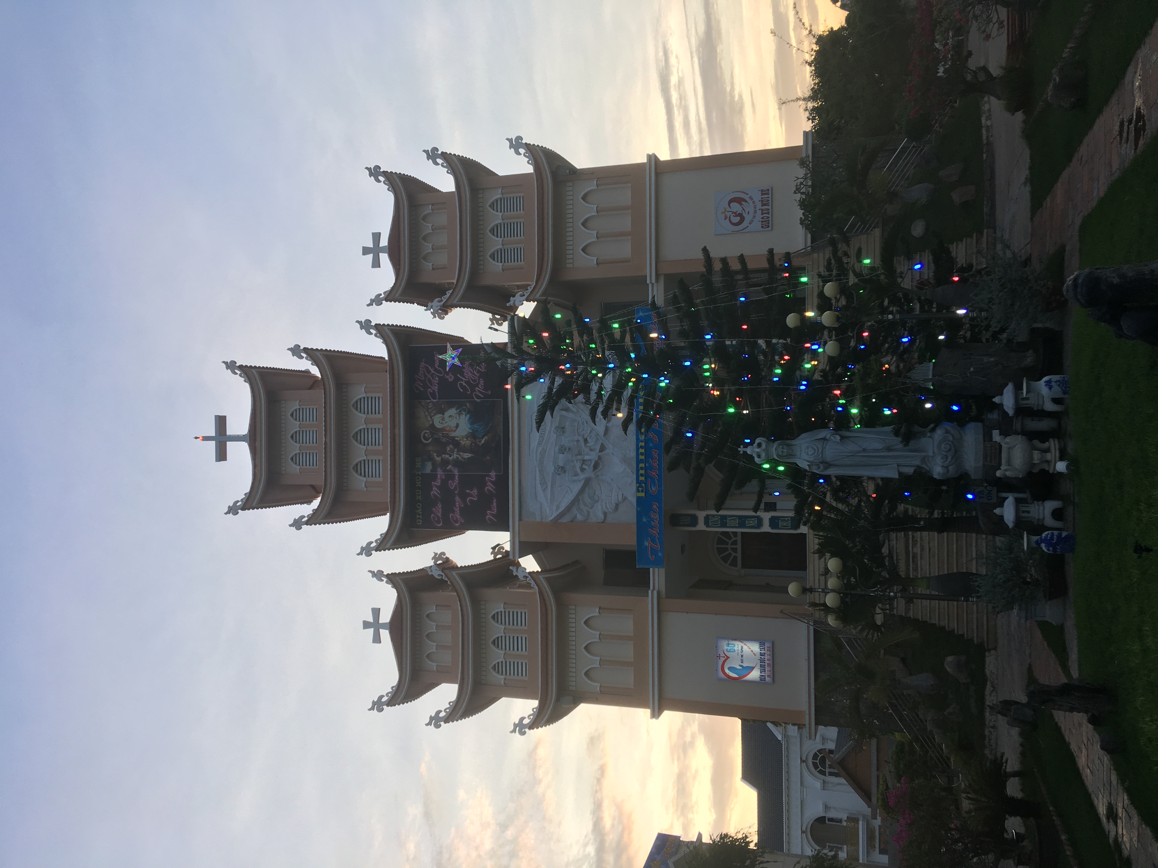 V centru města stojí netradiční katolický kostel. Místo obvyklých dračích hlav v rozích říms jsou holubice na ratolestích. Kostel je dvoupatrový a do zvonice jezdí výtah. Během naší návštěvy probíhaly před kostelem i v něm čilé přípravy na blížící se Vánoce. V této oblasti Vietnamu jsou Vánoce velkou událostí.