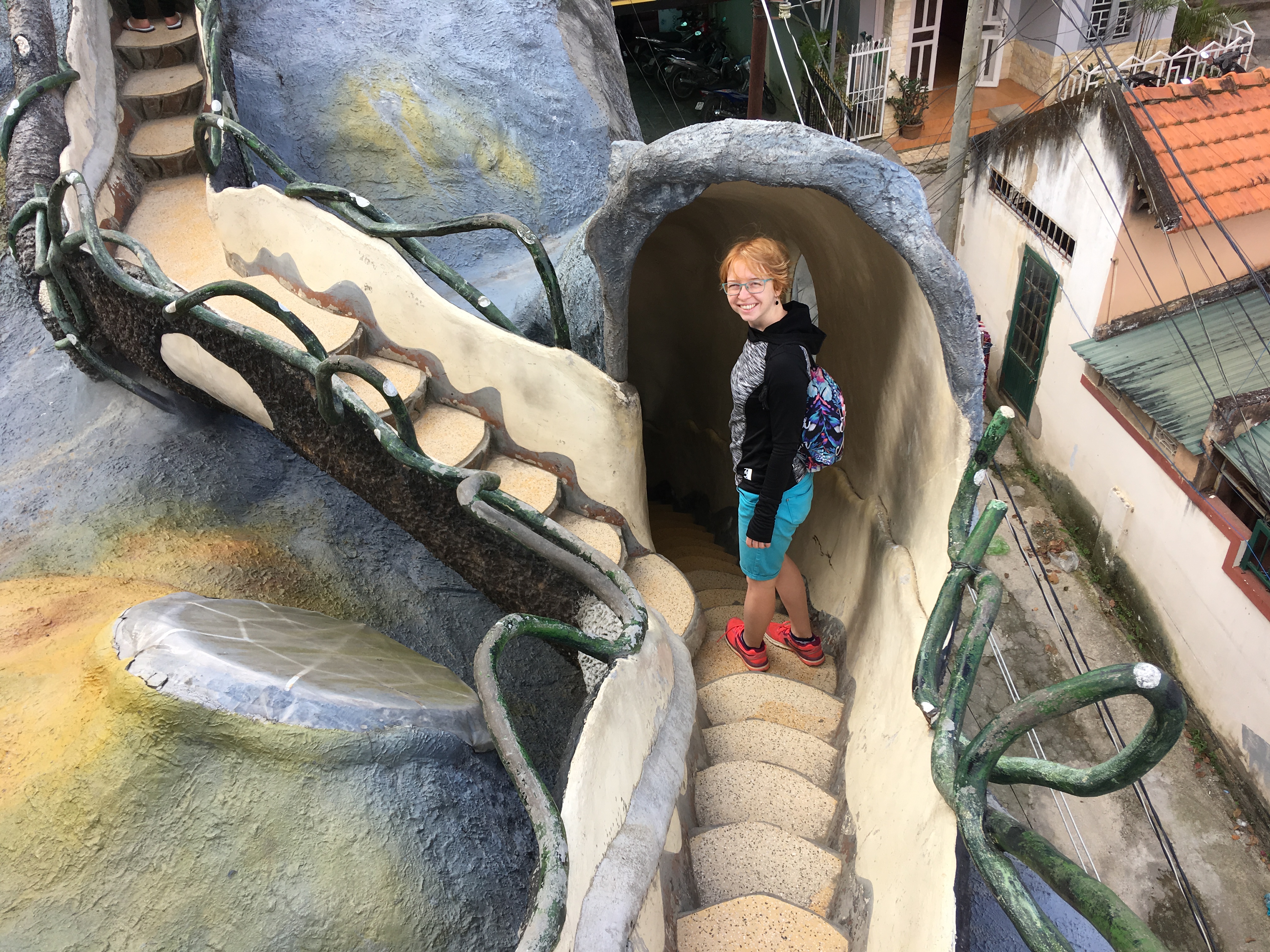 Autobus nám odjíždí až jednu hodinu po poledni, dopoledne tak můžeme strávit v jedné z místních turisticky nejnavštěvovanějších atrakcí. Autorkou výstředního domu ve stylu surrealismu je vietnamská architektka Dr. Dang Viet Nga. Celý projekt domu se zahradou není ale dosud dokončen. I dnes, v neděli, zde probíhají stavební práce. Podle autorčiných slov je architektura domu inspirovaná sepětím člověka s přírodou. Na nás dům v jistém ohledu působí dosti kýčovitě.