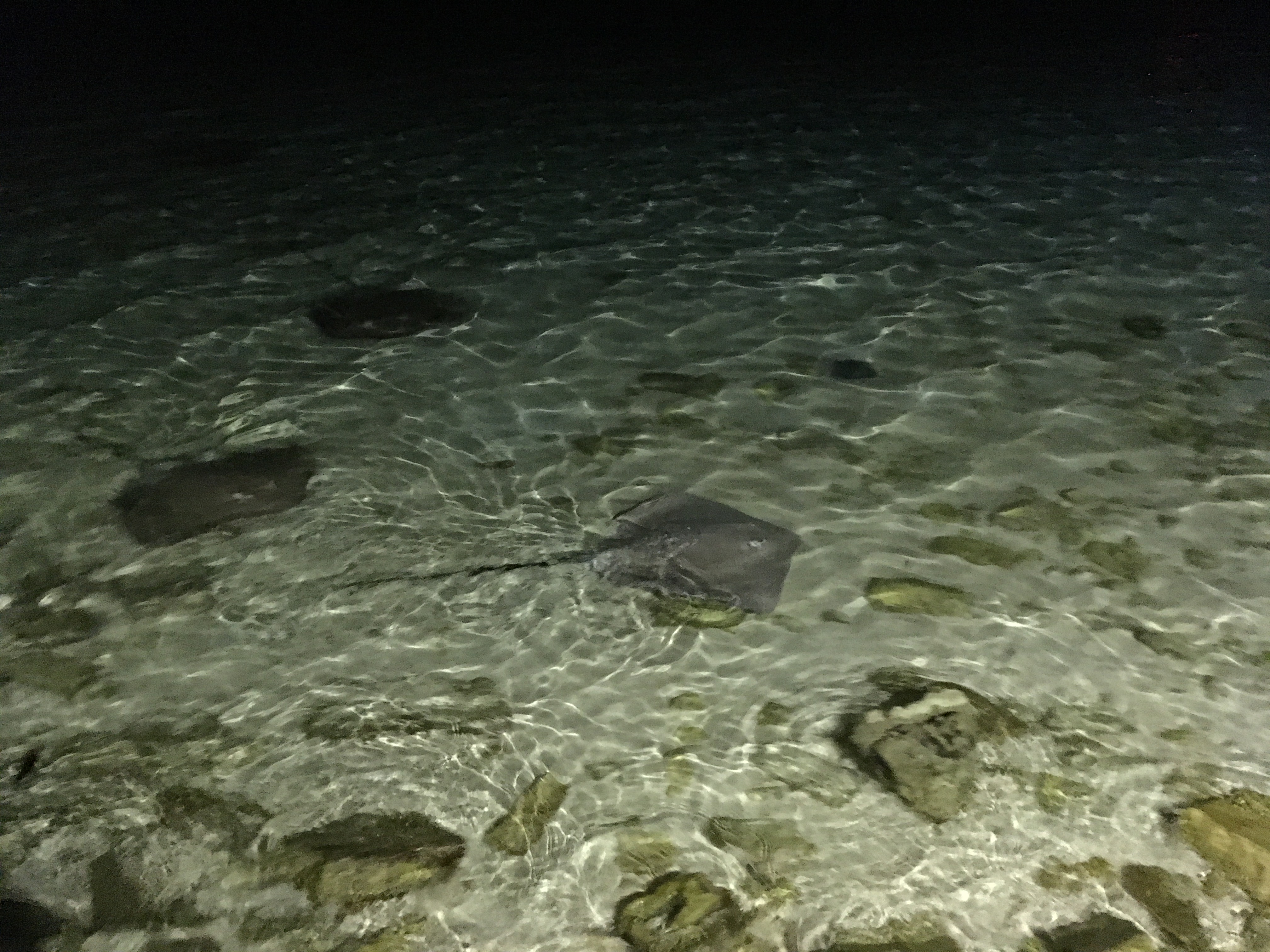 Při večerní procházce po břehu si všimneme černých stínů míhajících se v mělké vodě těsně u břehu. Čile si tu rejdí celé hejno rejnoků.